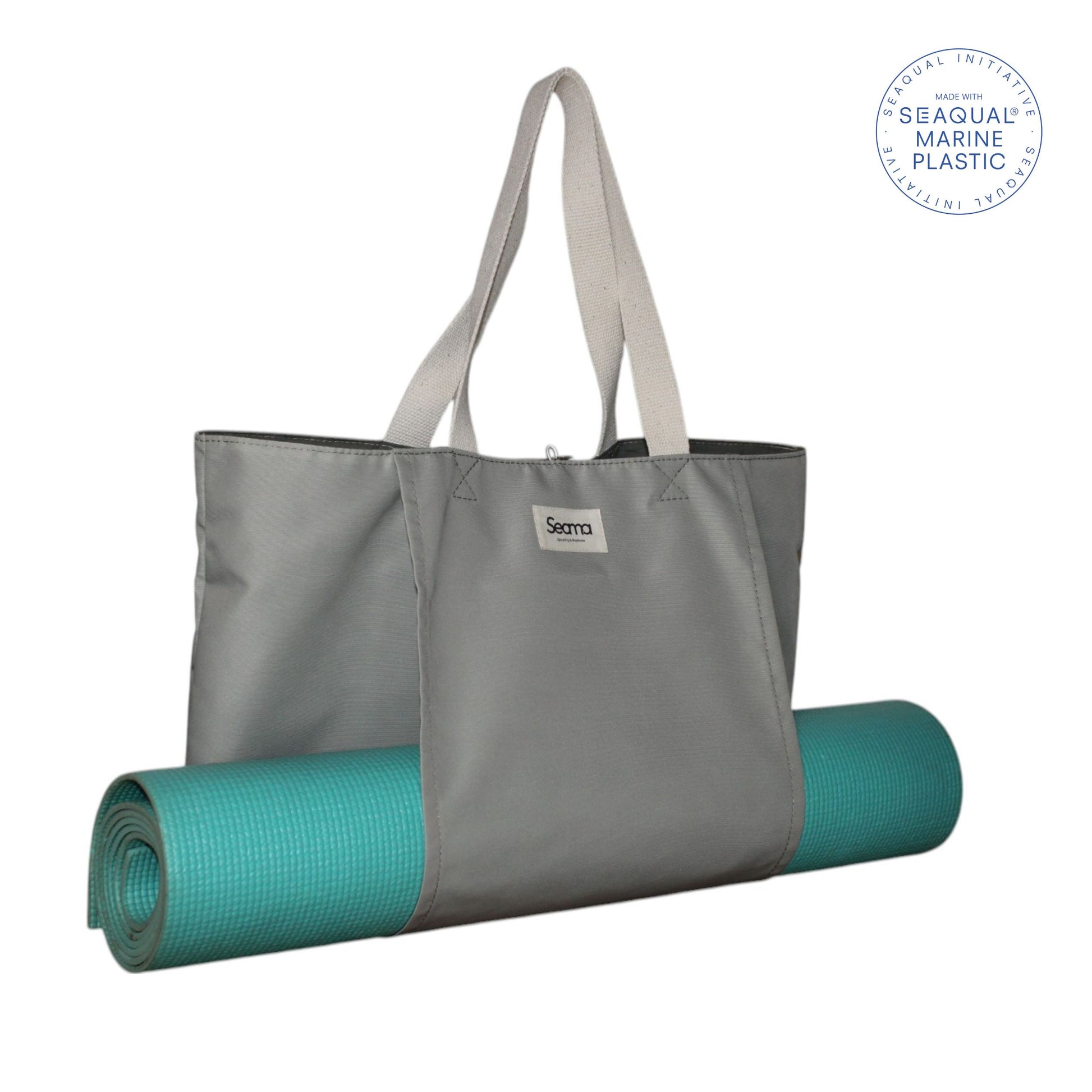 A perfect combination of comfort and eco-consciousness, the Asana Yoga Bag is made from 100% recycled polyester certified by SEAQUAL® MARINE PLASTIC. This fabric contains approximately 10% marine plastic waste and 90% is made from post-consumer PET sourced from land. Lined inside with cotton from end-of-series stock, the Asana bag features a specially designed space for your yoga mat, a roomy compartment for your accessories, an internal pocket and a hook closure. Color: dove grey Handcrafted, Made in Italy.