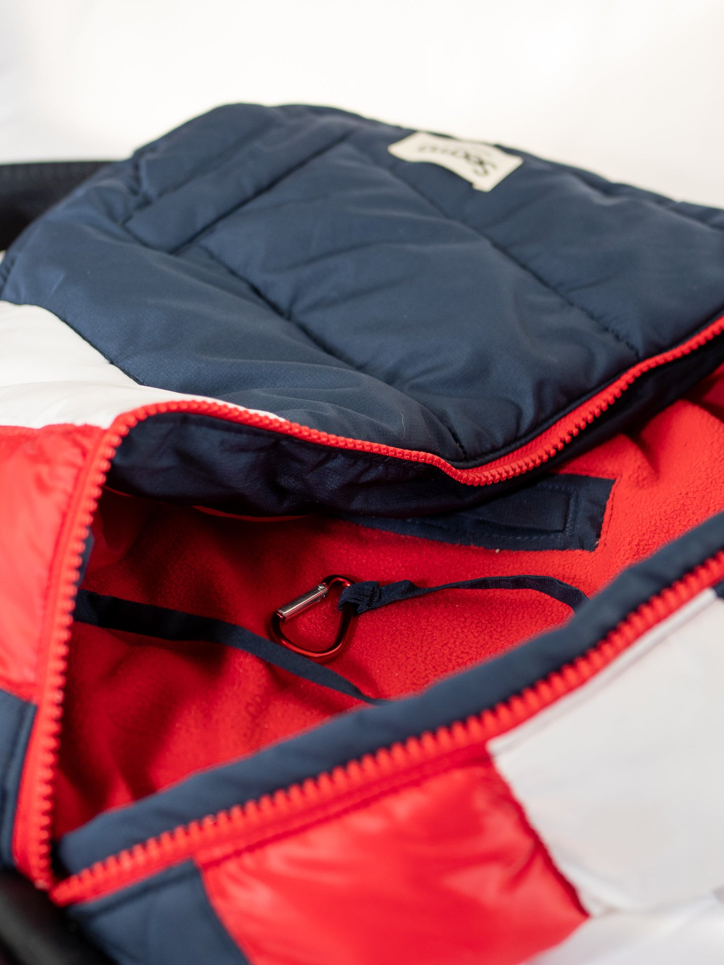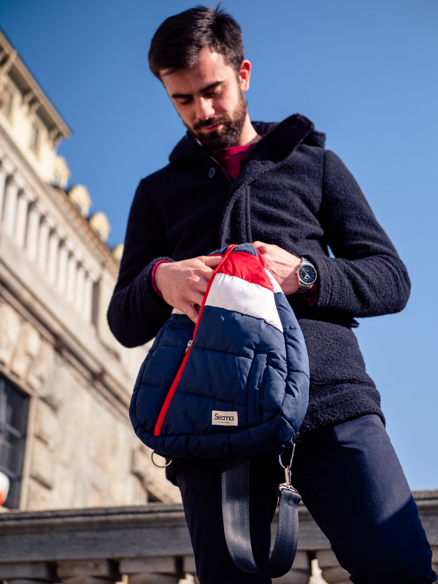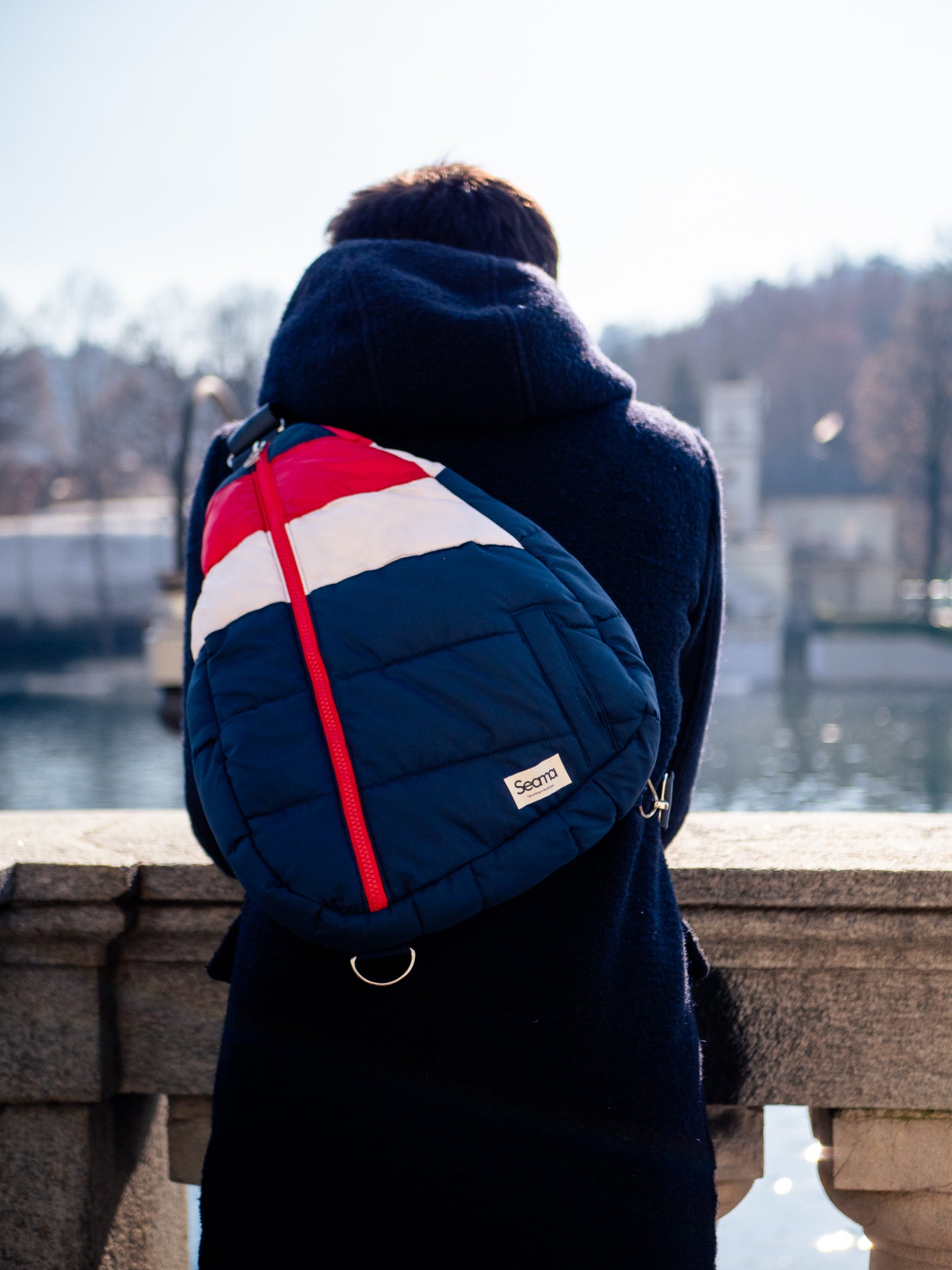 Cheerful and versatile, the Multidrop is a single-shoulder backpack that can be worn on the right or left, thanks to an adjustable hook. Equipped with a red oblique front zip, the Multidrop has an internal pocket for small items and a red carabiner for hanging keys.