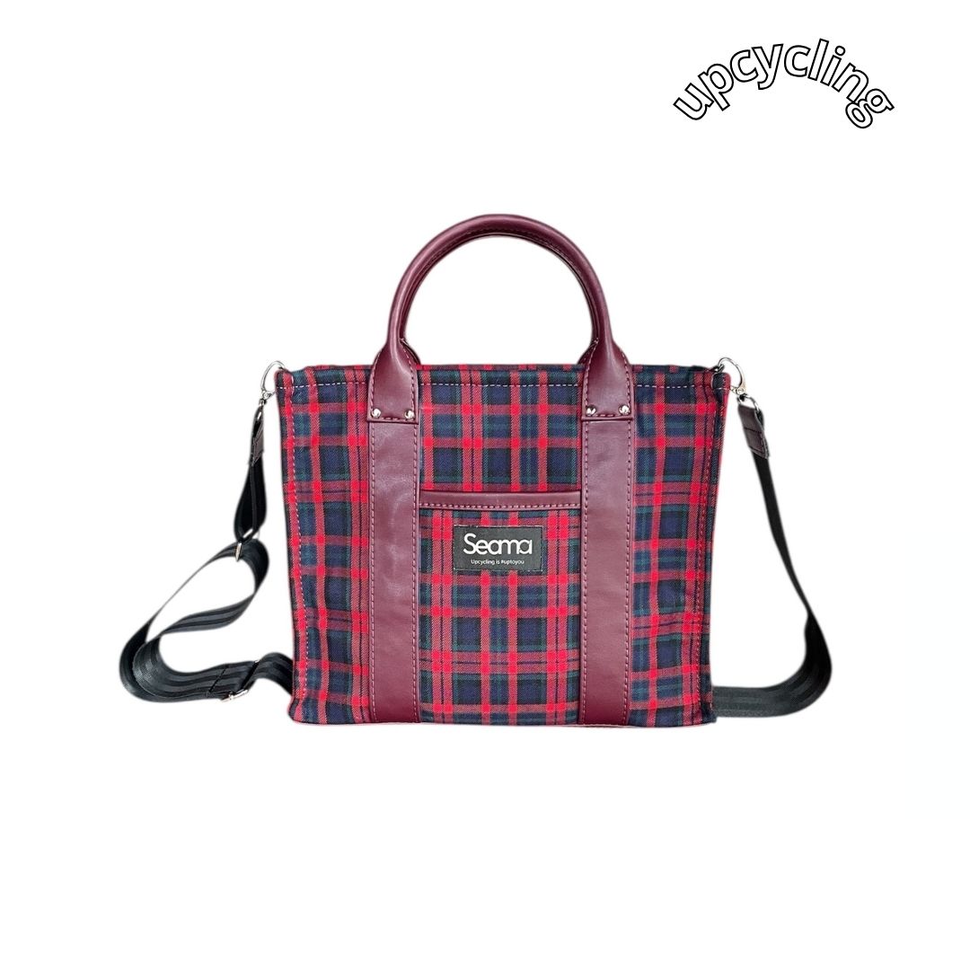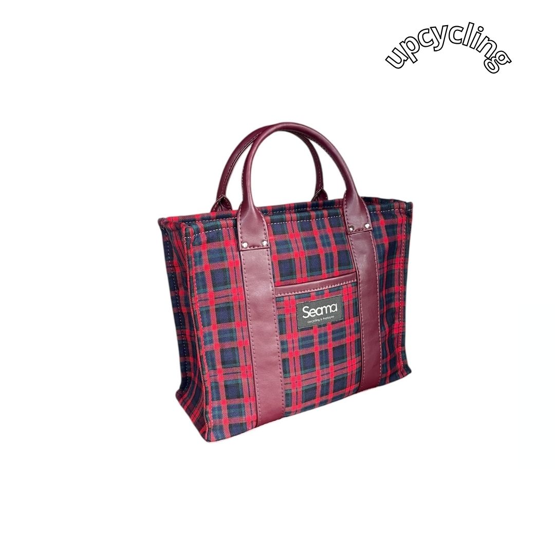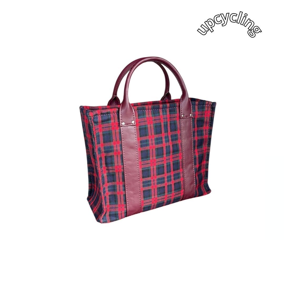 The Scottish Loch Tote is an elegant and sustainable bag, crafted from a tartan-patterned fabric in shades of red, blue, and green. It is enhanced with burgundy details made from an alternative-to-leather material, adding a refined touch.