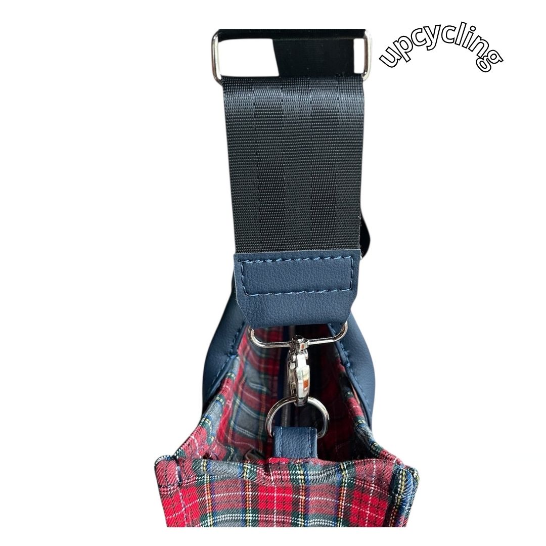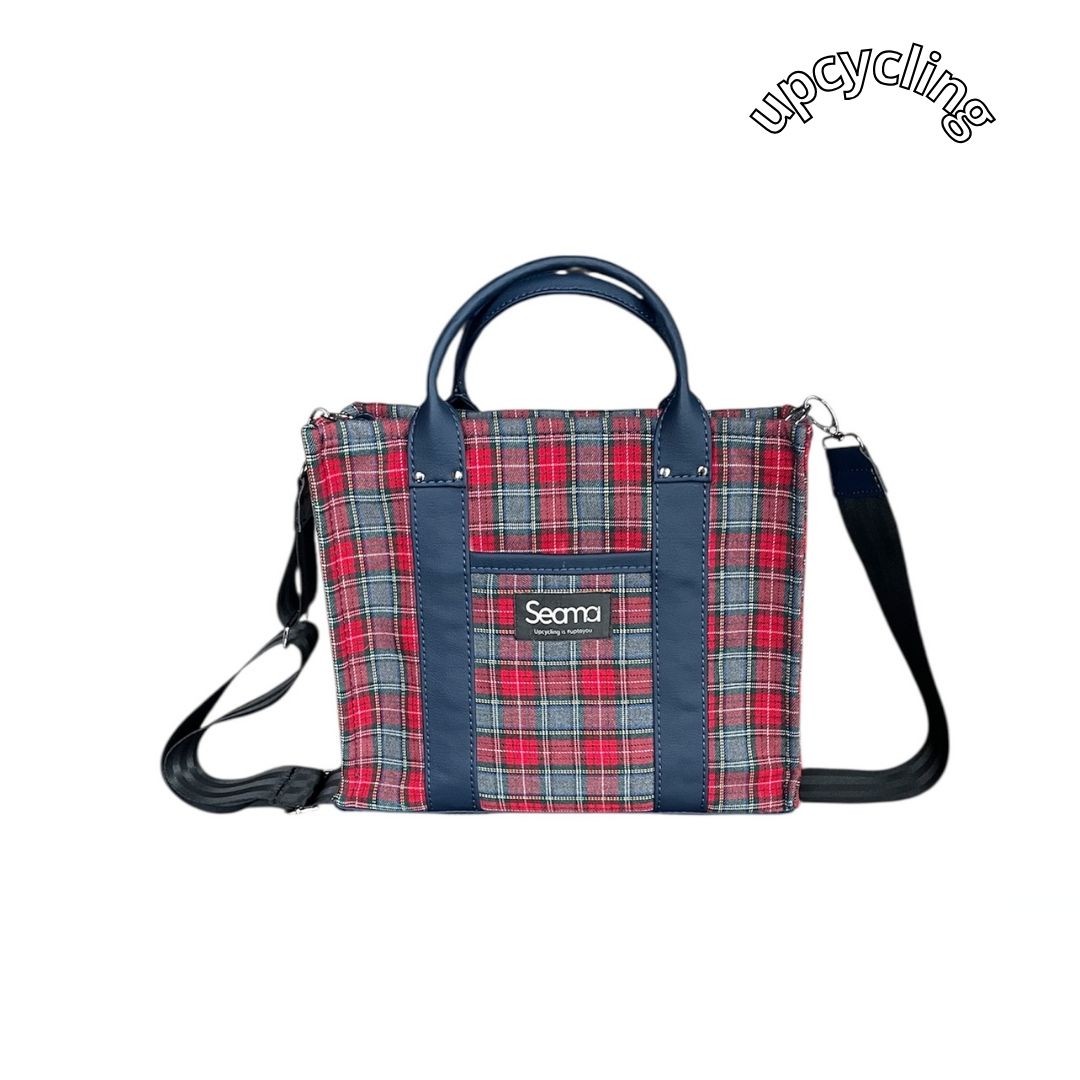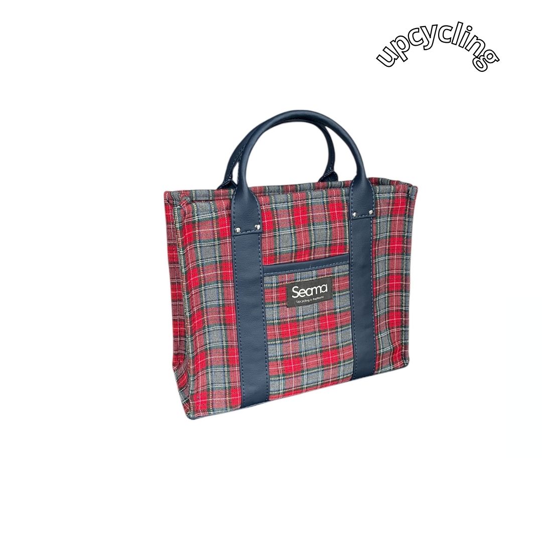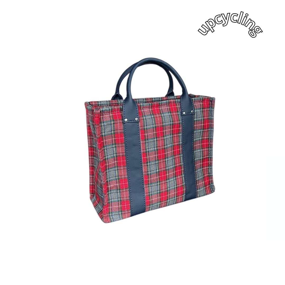 The Scottish Loch Tote is an elegant and sustainable bag, crafted from a tartan-patterned fabric in shades of red, blue, and green. It is enhanced with burgundy details made from an alternative-to-leather material, adding a refined touch.