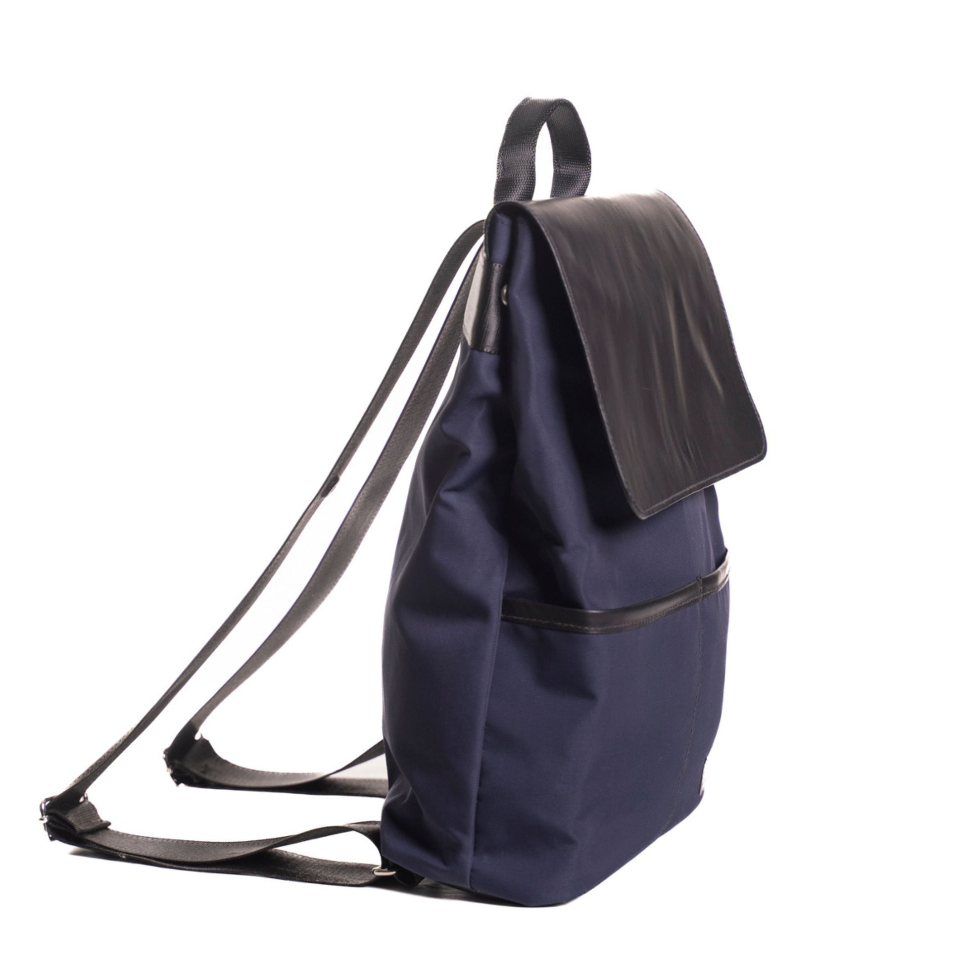 The flap, bottom and edges of the backpack are made from black leather scraps.