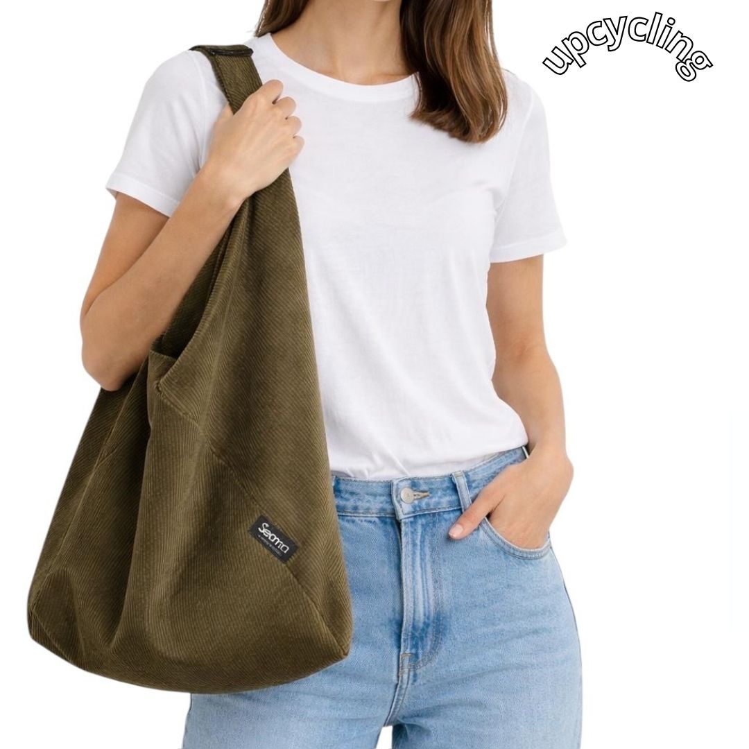La prevalenza di materiali di recupero ed il processo di upcycling consentono di ridurre i consumi inerenti alla produzione e sottrarre tessuti alla discarica. Piccole imperfezioni non sono da attribuirsi a un difetto di fabbricazione ma alla particolarità del materiale e della produzione artigianale in upcycling.