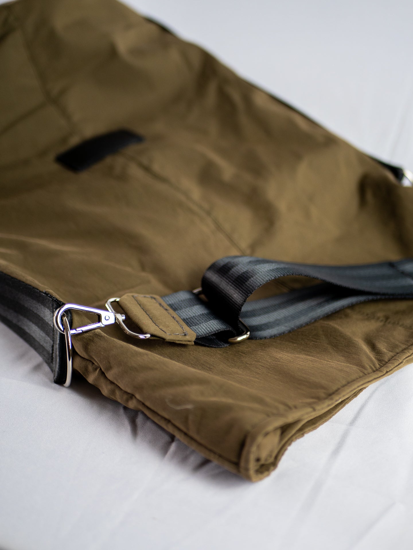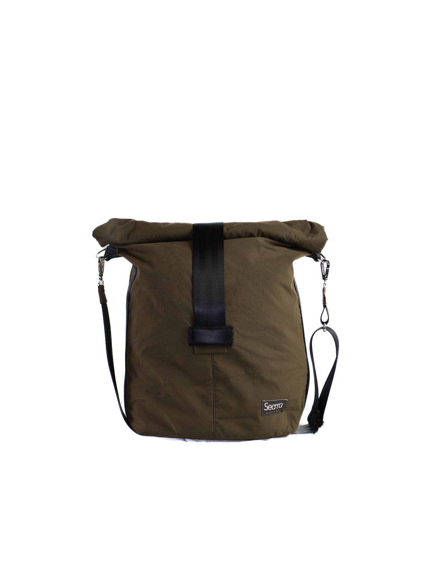 La tracolla regolabile e la fibbia di chiusura provengono da cinture di sicurezza.