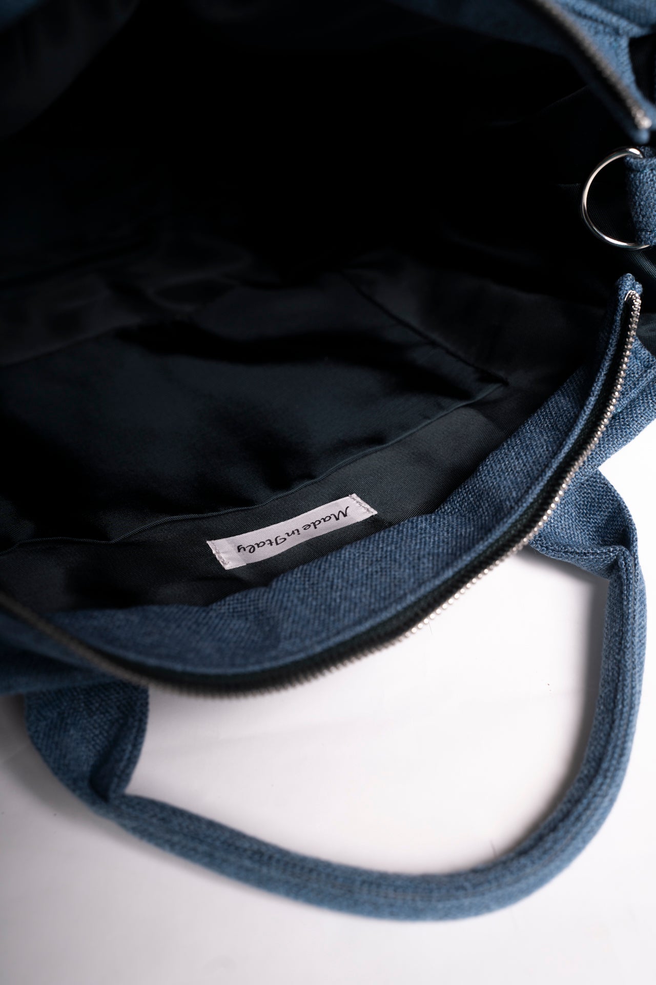 La prevalenza di materiali di recupero ed il processo di upcycling consentono di ridurre i consumi inerenti alla produzione e sottrarre tessuti alla discarica. Piccole imperfezioni non sono da attribuirsi a un difetto di fabbricazione ma alla particolarità del materiale e della produzione artigianale in upcycling.