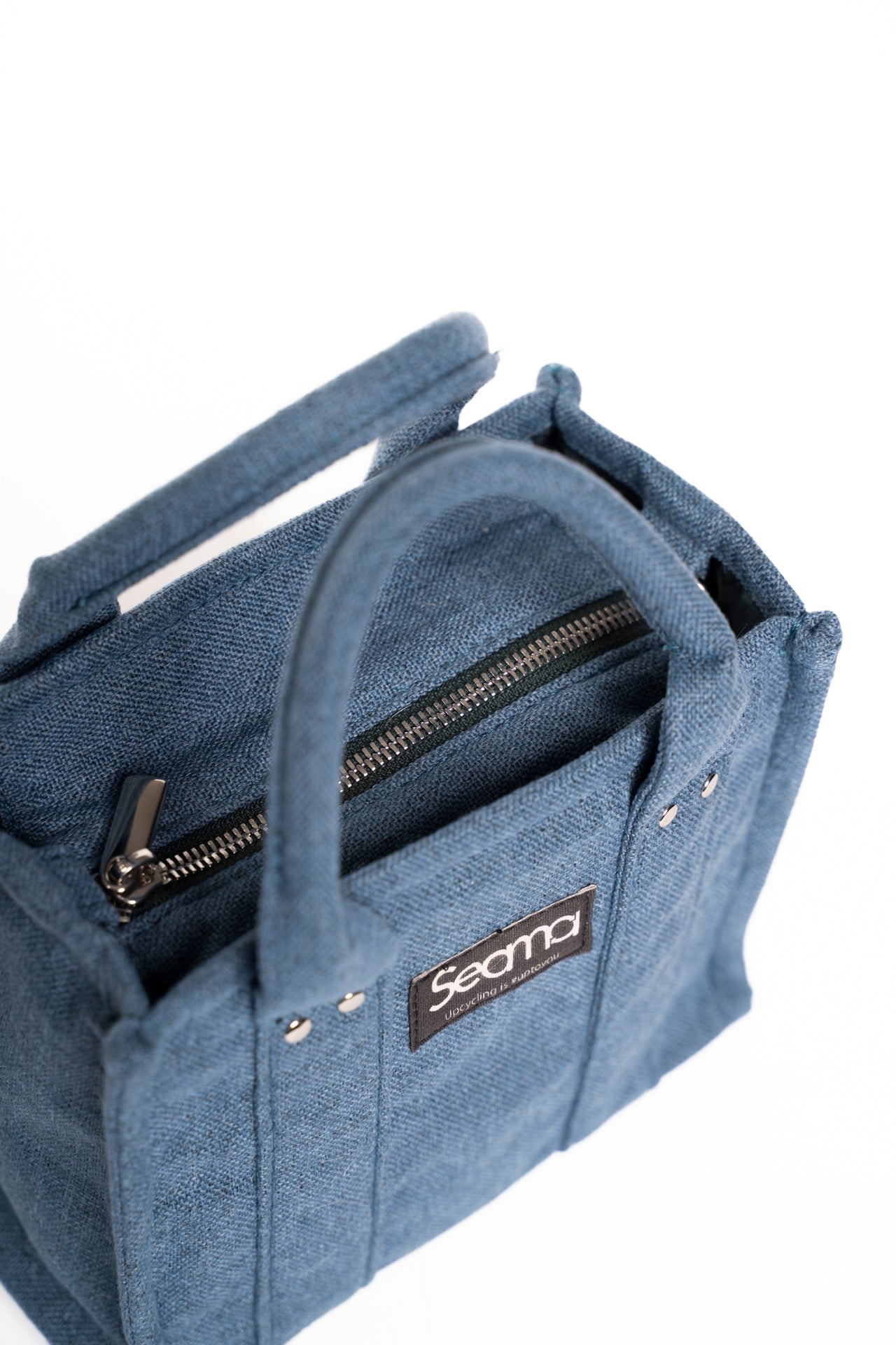 La prevalenza di materiali di recupero ed il processo di upcycling consentono di ridurre i consumi inerenti alla produzione e sottrarre tessuti alla discarica. Piccole imperfezioni non sono da attribuirsi a un difetto di fabbricazione ma alla particolarità del materiale e della produzione artigianale in upcycling.
